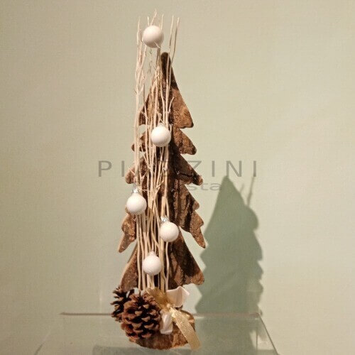 Originale piccolo albero in corteccia di legno , decorato con palline vetro ed altri elementi natalizi .