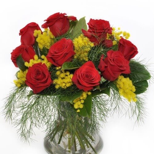 Bouquet con rose rosse e mimosa confezionato con cura.