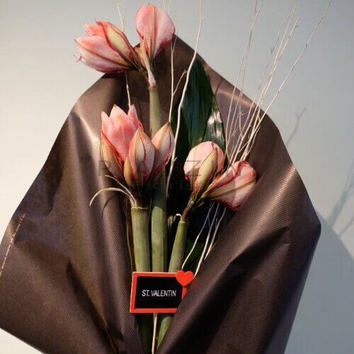 Composizione stilizzata con 3 steli Amaryllis , lavagnetta S.Valentino il tutto racchiuso da carta prestige .