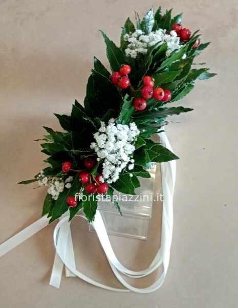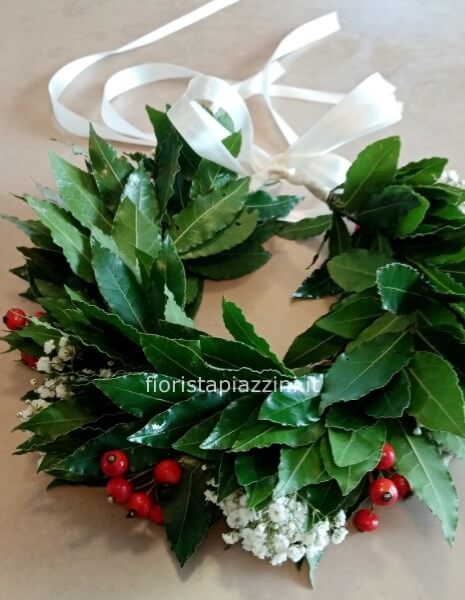 Scopri la nostra esclusiva 'Coroncina alloro con bacche e gipsofila', un prodotto artigianale realizzato con fiori freschissimi, pensato per festeggiare la tua Laurea con eleganza.