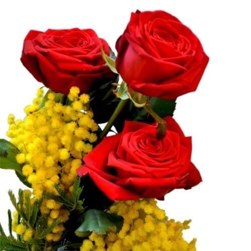 / Mazzo con tre rose rosse e mimosa confezionato da regalo